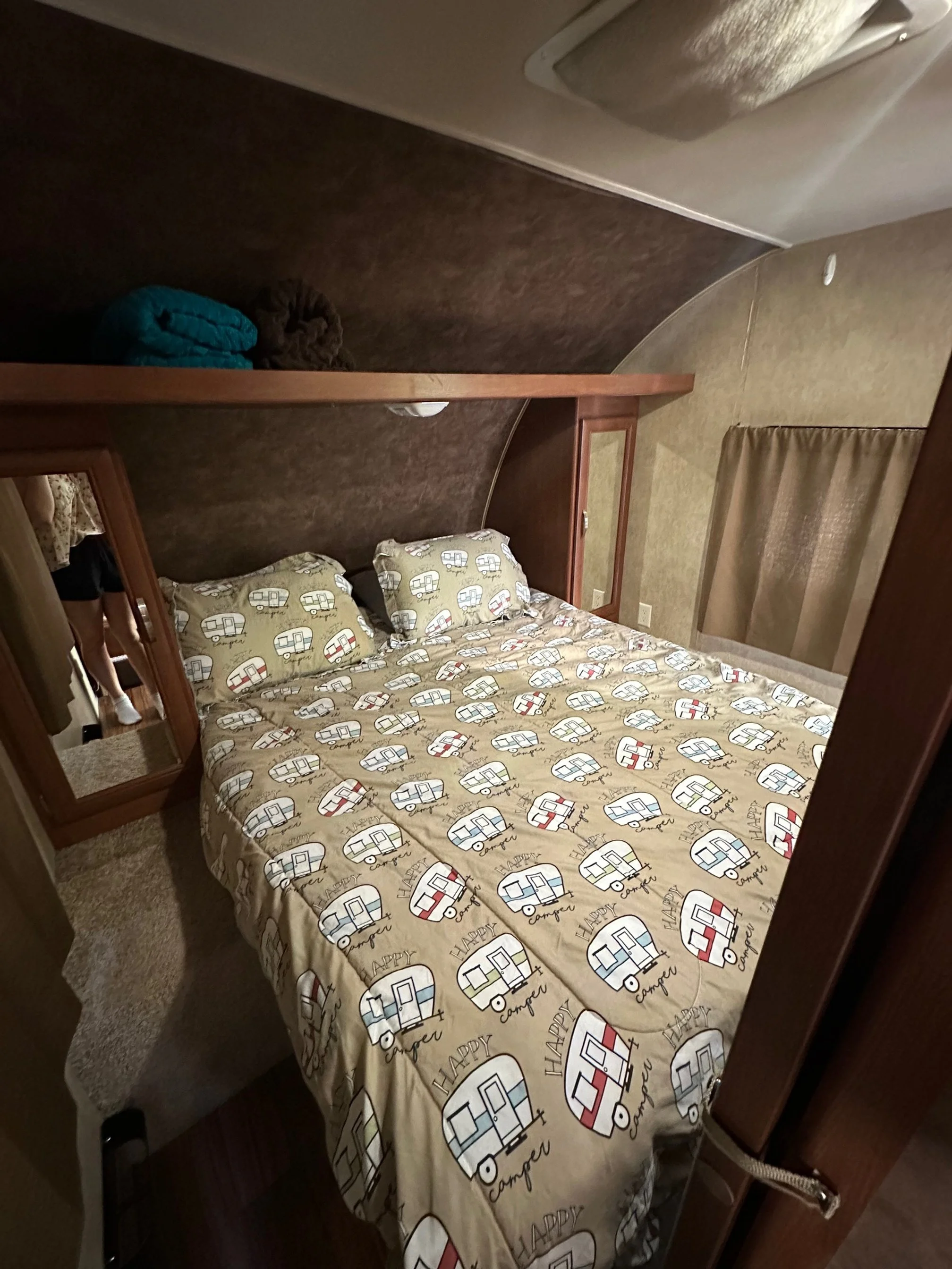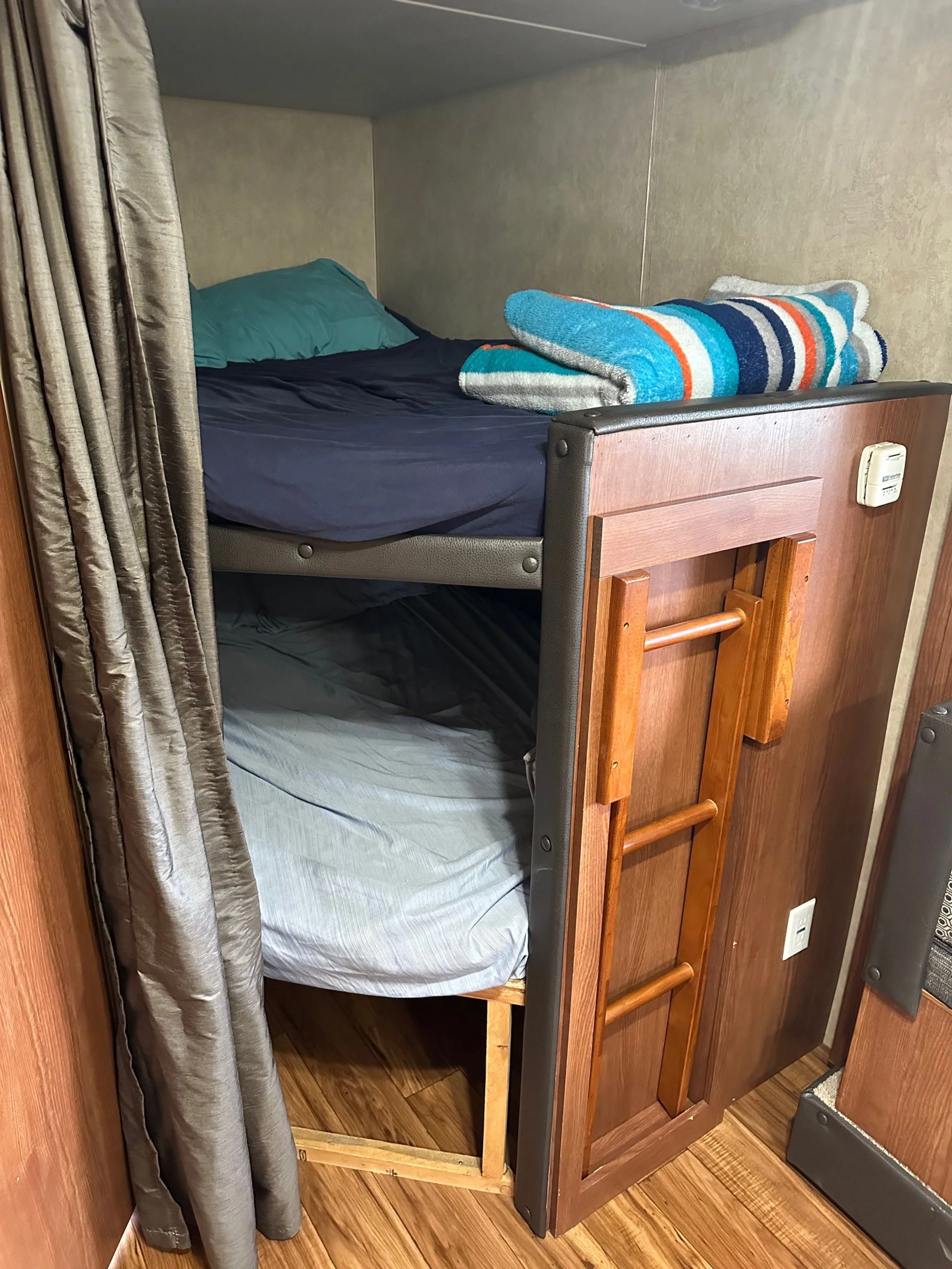 A cozy camper with a queen-size bed, and two full-size bunk beds.