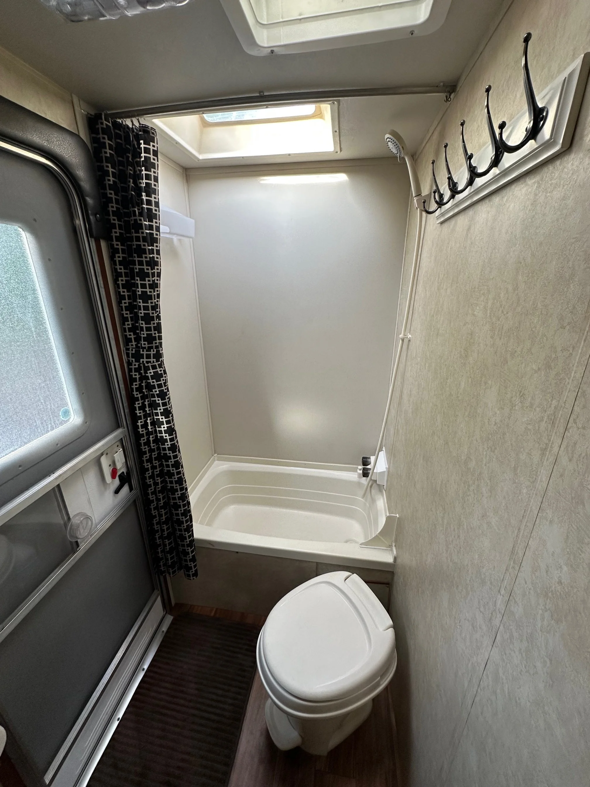 The camper includes a queen-size walk-around bed, and two snug full-size bunks. The couch and table may also turn into beds for children. It features a kitchen, refrigerator, microwave, and TV.